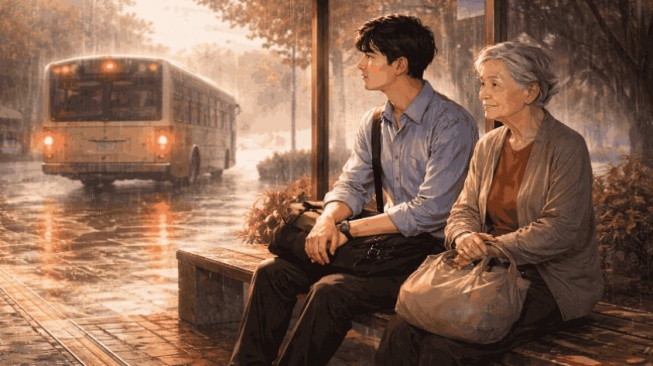 Di halte yang sama, seorang ibu tua duduk sambil memegang tas kain lusuh. Rambutnya memutih, bajunya sederhana. Ia tersenyum kecil saat aku berdiri di sampingnya.