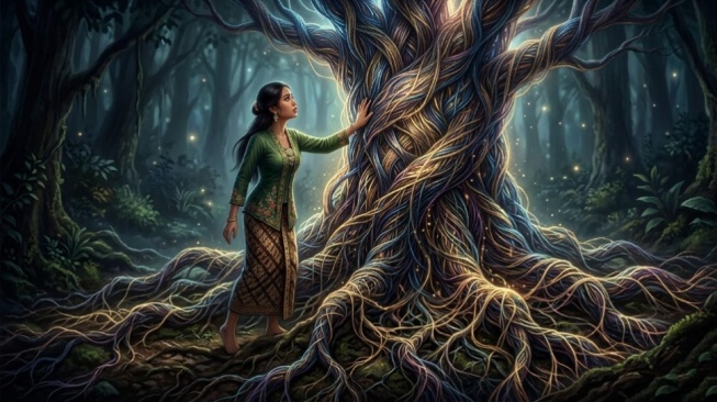 Di puncak, ada satu buah hitam mengkilap. Buah itu berdenyut seperti jantung. Arunika memetiknya. Buah itu pecah, mengeluarkan ribuan benang kecil yang beterbangan seperti laba-laba.