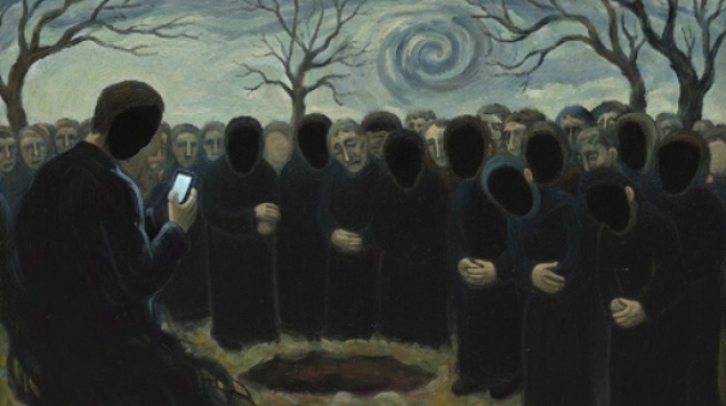 Saat petugas pemakaman memberikan isyarat untuk bekerja, mereka mulai menyekop tanah pertama. Sebuah suara memecah keheningan. Bukan suara tangisan, melainkan bunyi notifikasi pesan singkat yang muncul serentak. Ting.