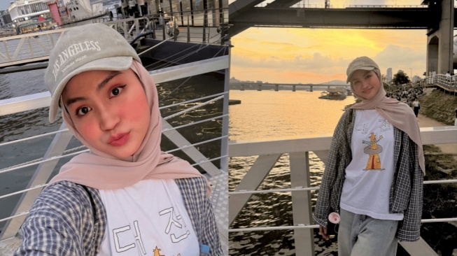 Untuk look terakhir, Xaviera tampil lebih santai dengan sentuhan street style khas Korea. Ia mengenakan kaos putih bergambar ilustrasi playful, yang dipadukan dengan kemeja kotak-kotak longgar sebagai outer.