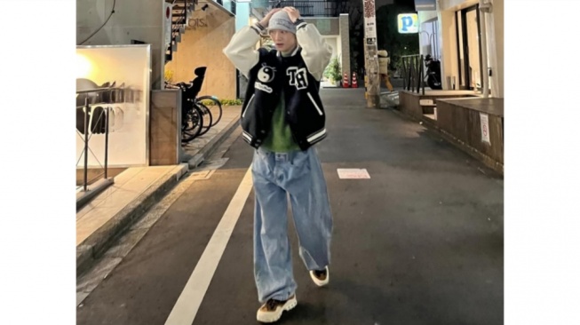 Untuk bagian bawah, ia memilih celana denim baggy berwarna biru muda dengan potongan extra wide leg yang memberikan volume maksimal pada siluet tubuhnya. Alas kakinya dilengkapi dengan sepatu bergaya chunky sneakers berwarna krem dan cokelat yang memiliki sol tebal. Penampilan ini kemudian disempurnakan dengan beanie hat warna abu-abu yang menutupi kepala, sehingga menciptakan kesan santai namun tetap terkurasi dengan baik untuk aktivitas di luar ruangan.