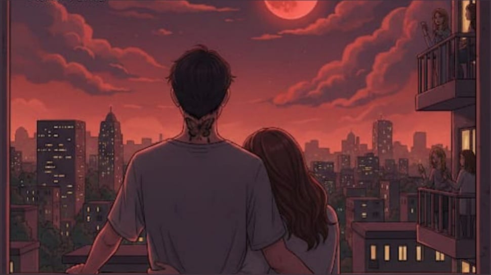 Mereka kini berdiri berdampingan, bahu bersentuhan. Bulan kian gelap, merahnya semakin pekat. Di bawah sana, terdengar sorak kecil dari balkon lain. Entah kagum, entah hanya ingin terdengar ikut serta.