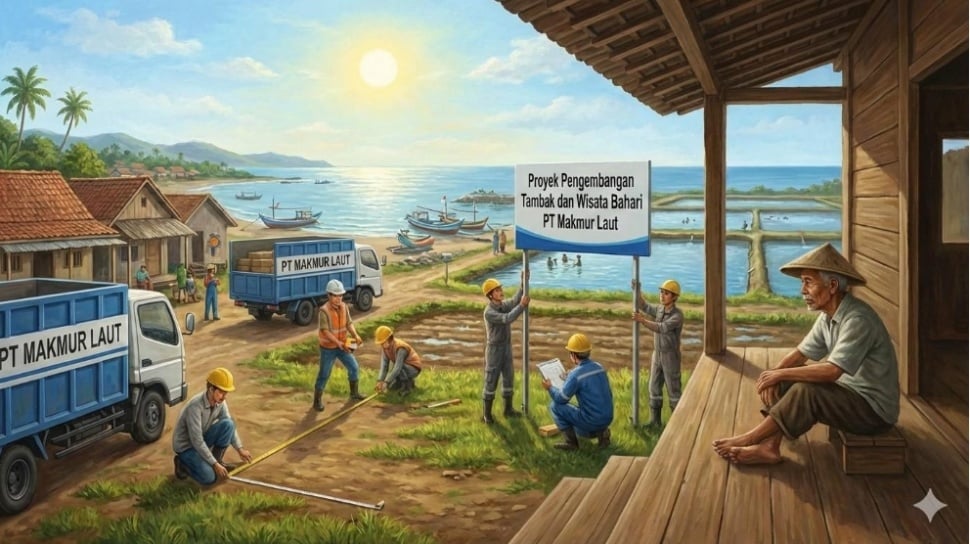 Siang itu truk-truk perusahaan datang. Beberapa pekerja muda turun, membawa alat ukur dan papan nama baru. Mereka memasang plang bertuliskan “Proyek Pengembangan Tambak dan Wisata Bahari – PT Makmur Laut”. Pak Kromo memandang dari beranda tanpa berbicara.