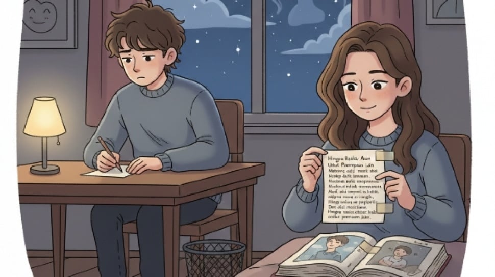 Suatu malam, hujan deras mengguyur Banyuwangi. Listrik padam, hanya lilin yang menyala redup di meja makan. Kau tarik buku itu dari rak, duduk di sebelahku. "Ingat puisi ini?" katamu, membuka halaman yang kusobek dulu. Aku mengangguk pelan, hati berdegup. "Kenapa kau buang?" tanyamu lagi, suara lembut tapi menusuk.
