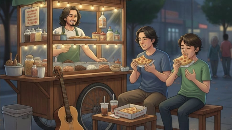 Kang Gondrong menepuk bahu kedua kakak beradik itu bergantian sambil tersenyum puas. Wajan kembali mendesis pelan, bulan menggantung pucat di atas kepala. Di bawah lampu gerobak yang temaram, sebuah keyakinan baru menguar di udara seperti aroma manis martabak buatannya.