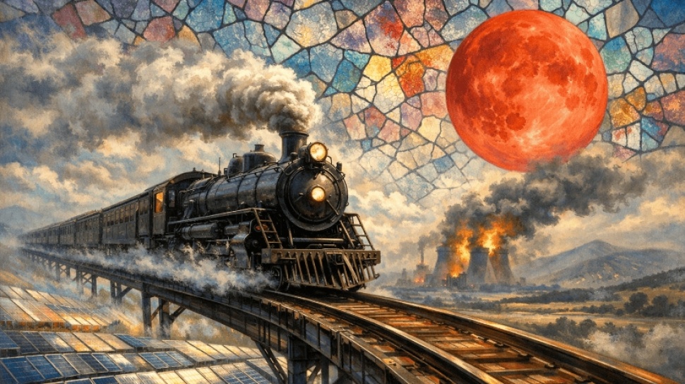 Panorama di luar jendela tampak tak masuk akal; bukit berlapis kaca, langit retak berwarna-warni seperti mozaik jendela gereja, dan bulan yang bergerak maju mundur seperti jarum jam rusak.