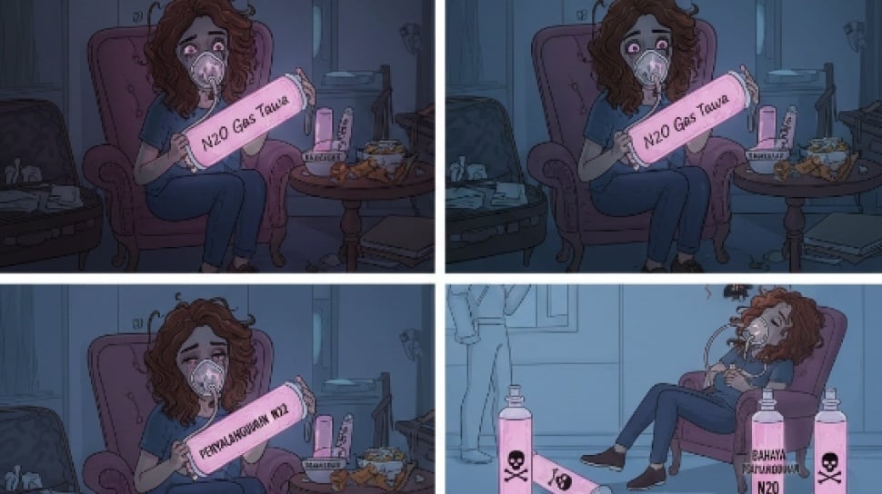 Namun, tiba-tiba napasnya pendek. Dadanya terasa ditekan. Ia mencoba berhenti, tetapi tangannya sudah lemas. Ia tidak tahu bahwa gas tawa dalam jumlah besar bisa mengurangi oksigen dalam tubuh, menyebabkan sesak napas, kehilangan kesadaran, gangguan irama jantung, bahkan kematian—terutama jika dipakai secara berlebihan, sendirian, dan dicampur dengan kebiasaan lain seperti merokok atau alkohol.