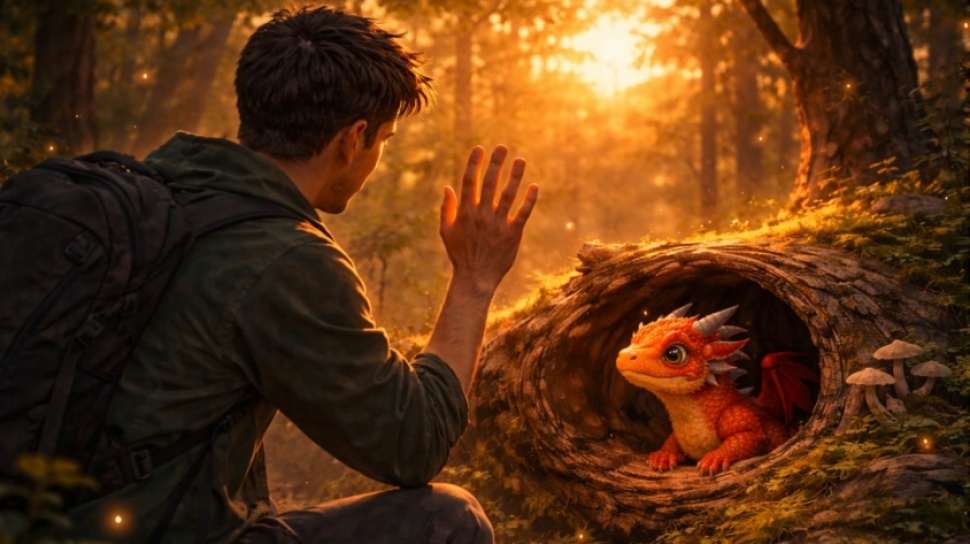 Aku refleks mundur setengah langkah karena kaget. Jantungku berdegup kencang, takut itu ular atau hewan buas. Namun, dari dalam lubang itu, perlahan muncul makhluk kecil. Tubuhnya tidak lebih besar dari botol minum ukuran sedang. Sisiknya berkilau samar, warnanya unik seperti campuran merah bata dan oranye yang lembut, bukan warna mencolok yang menakutkan. Matanya besar, bulat sempurna dengan pupil vertikal, dan… terlihat penasaran.