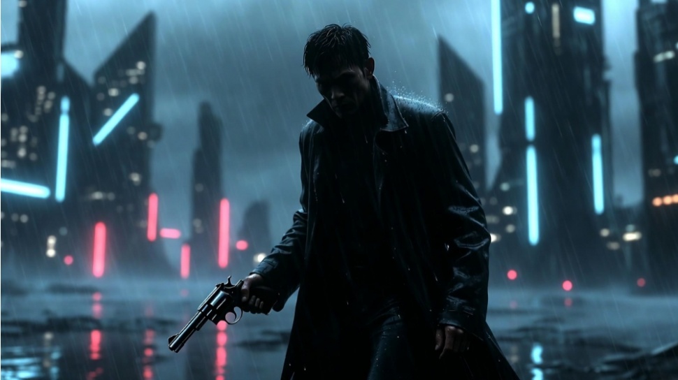 Pria itu—karena ia tak pernah punya nama yang tetap—melangkah keluar dari kegelapan. Mantel panjang hitamnya masih basah oleh hujan deras di luar. Di tangan kanannya, sebuah revolver tua, model yang sudah jarang terlihat di kota ini sejak larangan senjata api tahun 2031.