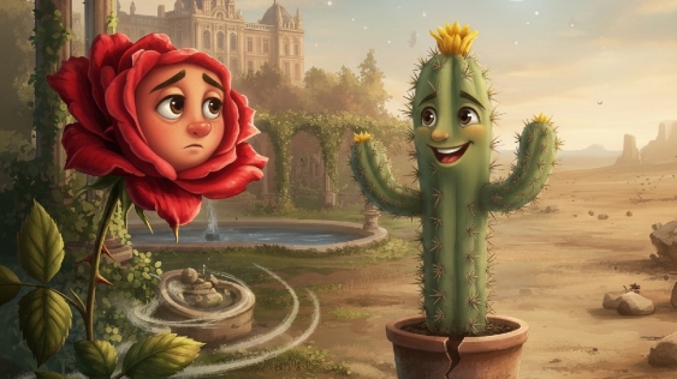 Kaktus menatap Mawar lama, seolah membaca setiap luka yang tersembunyi di balik kelopaknya.