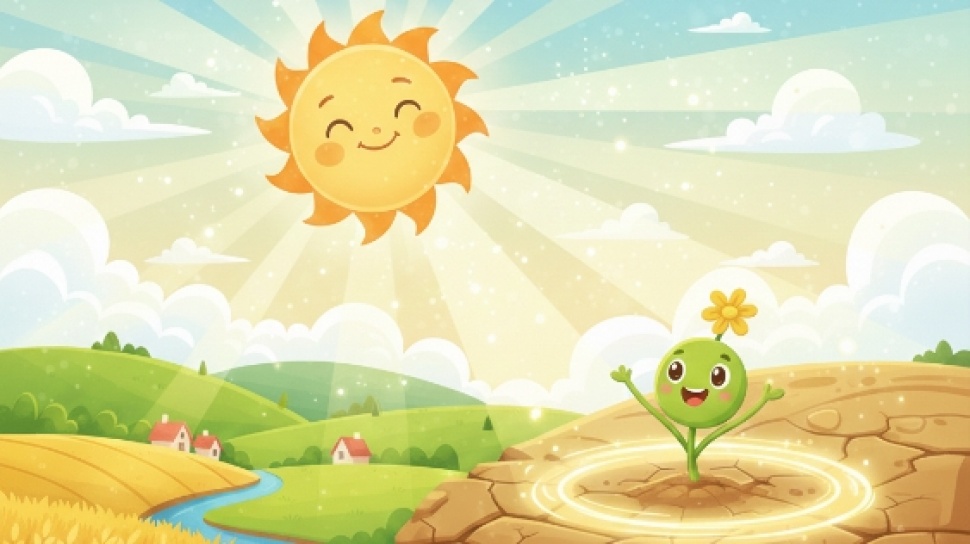 Suatu hari, hujan turun. Tidak deras, hanya gerimis lembut yang membasahi tanah retak itu. Tetes demi tetes meresap perlahan, membawa kesegaran yang hampir tak terlihat. Setelah hujan berhenti, Matahari kembali muncul dan menyinari tanah itu seperti biasa.