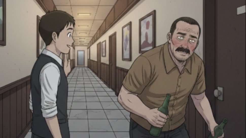 Seorang tamu lain, juga sama mabuk berat, berjalan sempoyongan di koridor. Matanya merah, wajahnya panas. Begitu berdiri tepat di depan anak baru itu, sapaan yang sama meluncur.