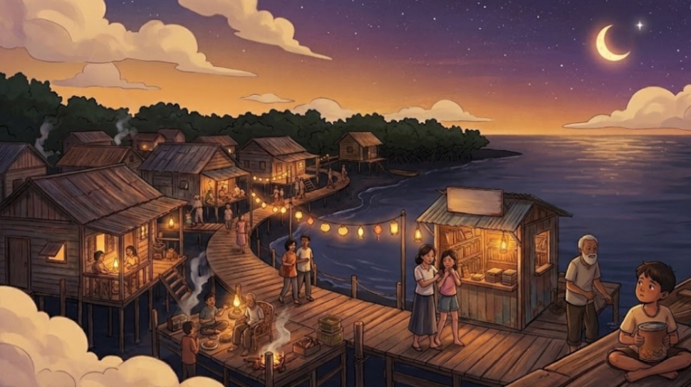 Aku selalu menyukai aroma garam yang beradu dengan wangi kayu manis dari dapur-dapur di pinggir dermaga ini. Di kampung nelayan ini, senja bukan sekadar tanda berakhirnya hari, melainkan awal kehidupan yang sesungguhnya. Aku bisa melihat semuanya dari ketinggian, melayang di antara celah awan, memperhatikan lampu-lampu minyak yang mulai dinyalakan di teras rumah panggung kayu yang sudah mulai lapuk dimakan usia.