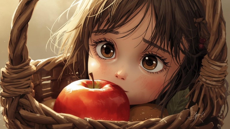 "Wah, buah apel merah besar rasanya memang sangat manis ya, Bu. Airnya juga begitu banyak dan segar. Terima kasih, Bu, Risa sangat senang," celoteh sang bocah sembari menikmati buah apel di tangannya.