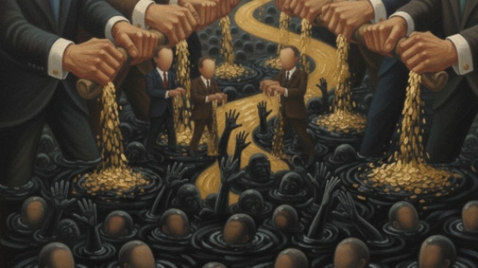 Ia kini melukis sesuatu yang baru: potret tangan-tangan berdasi yang sedang memeras aliran sungai hingga mengeluarkan emas, sementara di bawah kaki mereka, jutaan orang tenggelam dalam cairan hitam.