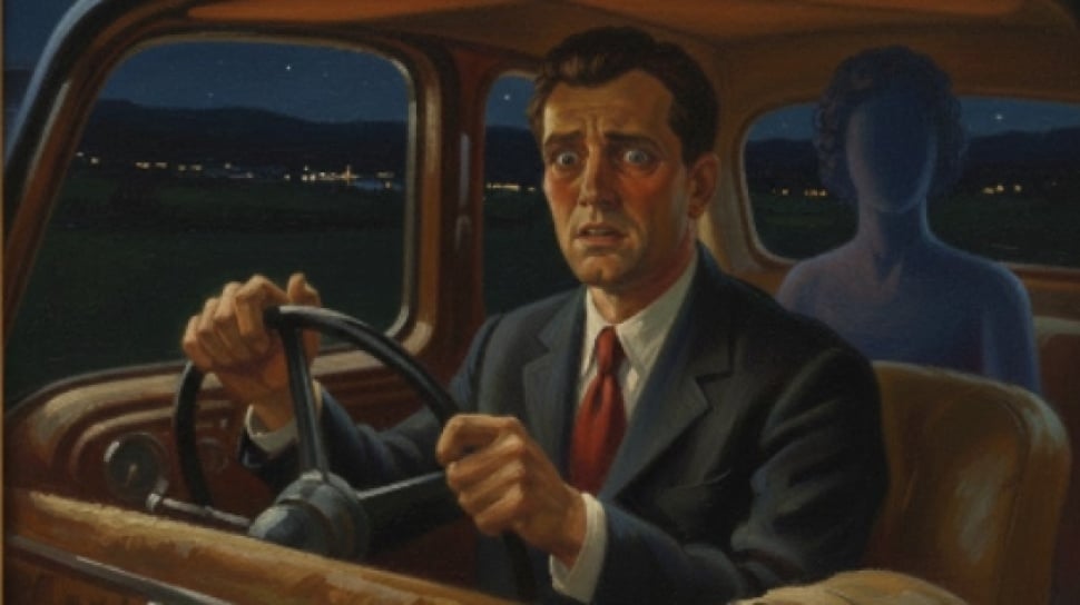 Lampu dasbor mobil mulai berkedip merah. Suara tawa yang melengking memenuhi kabin mobil, memantul dari kaca-kaca jendela. Tiba-tiba, di kursi penumpang sebelah Aris, muncul sosok wanita yang basah kuyup. Rambutnya yang panjang menutupi wajah, namun air yang menetes dari tubuhnya bukanlah air hujan, melainkan darah hitam yang kental.