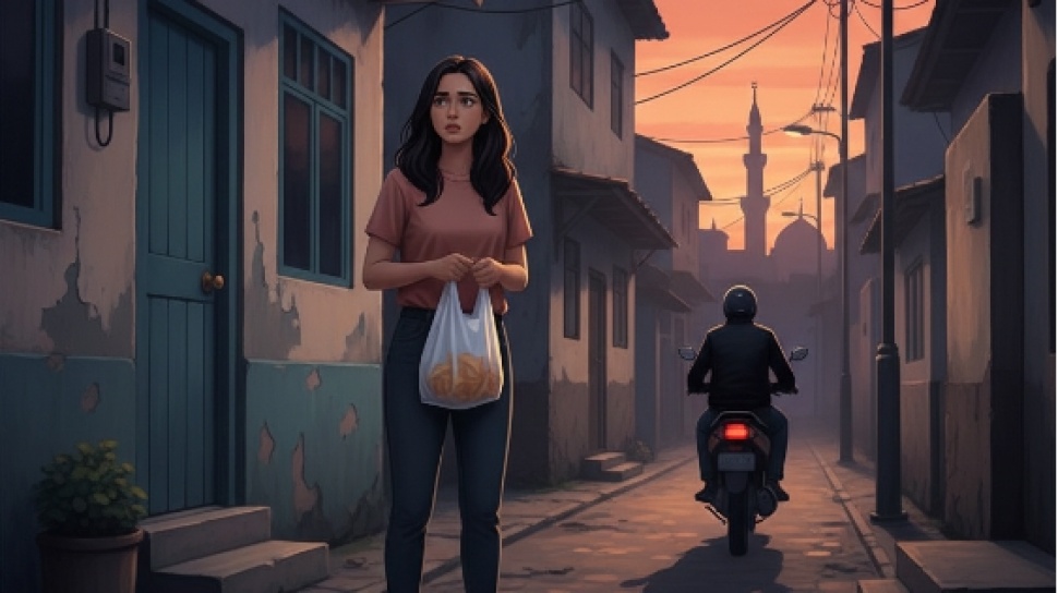 Saat itulah sebuah motor berhenti tepat di depan pagar. Alya menoleh. Pengendara itu mengenakan jaket hitam dan helm full face gelap. Tanpa membuka helm, ia turun sebentar, meletakkan satu kantong plastik putih di atas pagar, lalu kembali naik dan melaju pergi. Alya membeku beberapa detik.