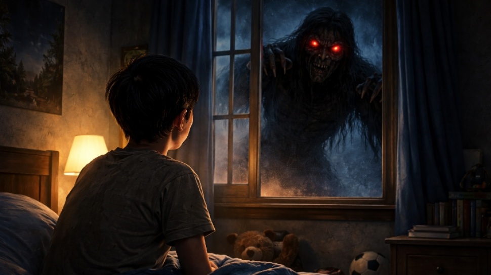 Tinggi, mengerikan, berdiri di sudut kamar. Kulitnya gelap seperti bayangan yang mengeras. Tangannya dan kukunya panjang. Saat wajahnya terangkat, matanya menyala merah. Giginya tidak rata, tajam seperti serpihan kaca.