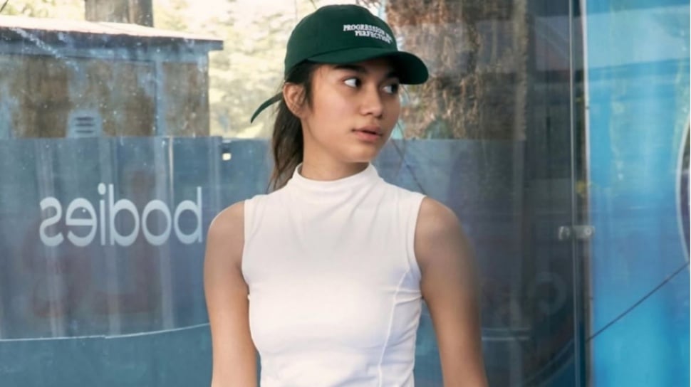 Dalam penampilannya, Azizah tampil memukau dengan gaya tenniscore yang segar dan kasual. Ia mengenakan crop tank top putih gading dipadukan dengan rok mini plisket hijau tosca, menciptakan kesan muda, sporty, dan ceria.