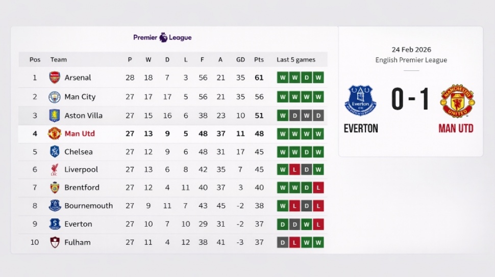 Kemenangan atas Everton membuat Manchester United kini mengoleksi 48 poin dari 27 pertandingan. Posisi keempat ini sangat krusial karena menjaga peluang mereka untuk mengamankan tiket Liga Champions tetap terbuka lebar.
