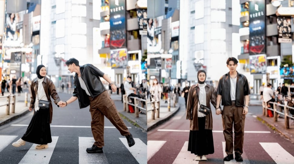 Foto terakhir membawa suasana yang lebih dinamis dan urban. Dinda dan Rey tampil di tengah keramaian kota dengan gaya street style yang tetap kompak. Dinda mengenakan long outer kulit cokelat dan rok hitam, sementara Rey tampil maskulin dengan jaket kulit serta celana kargo.
