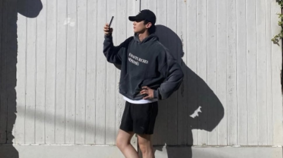 Hoodie yang digunakan memiliki detail dropped shoulder dan sedikit oversized, memberikan volume pada tubuh bagian atas. Untuk bawahan, ia menggunakan celana berpotongan wide leg yang lebar hingga kebawah yang memberikan kesan santai dan nyaman.