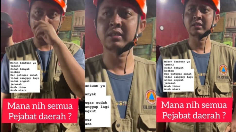 Seorang petugas BPBD Aceh tampak menahan tangis saat mengakui timnya tak lagi sanggup mengangkut jenazah. Ia juga memohon bantuan masyarakat karena akses komunikasi, BBM, dan jalur darat sudah terputus selama empat hingga lima hari.