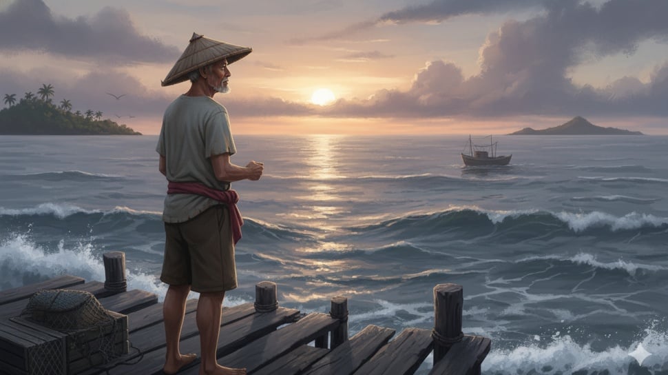 Yang paling mengesankan dari Pak Tua bukan hanya ketekunannya, melainkan kemauannya untuk berbagi. Ia duduk di tepi perahu, mengajari anak-anak muda membaca langit, merasakan arus lewat ujung kaki, dan mengenali bau hujan. Ia mengajarkan tentang jeda: kapan harus berangkat dan kapan harus pulang. Dalam dunia yang tergesa-gesa, pelajaran tentang berhenti sering kali lebih menyelamatkan. Ia juga mengajarkan untuk menghitung "cukup": membawa pulang seperlunya dan menyisakan untuk esok. Bagi Pak Tua, keberlanjutan bukanlah istilah besar, melainkan kebiasaan kecil yang diulang dengan setia.