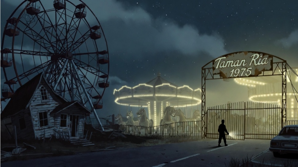 Mobilnya berhenti di gerbang berkarat bertuliskan Taman Ria 1975. Andi mematikan mesin, angin malam menusuk kulitnya. Dia menyenter ke depan, melihat reruntuhan wahana: bianglala patah, rumah hantu yang roboh. Tapi di tengah, samar-samar, ada siluet komidi putar.