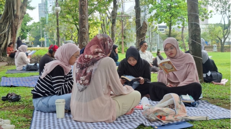 Minggu (26/4/2026), di tengah hiruk-pikuk Taman Menteng, puluhan orang tampak duduk berjajar di atas rumput, masing-masing larut dalam buku yang mereka bawa.